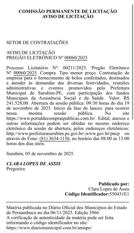 Replicando o modus operandi das gestões “sob seu guarda-chuva” em Casinhas e Orobó, o prefeito de Surubim, Cleber Chaparral, lançou uma licitação para a contratação de empresa para o fornecimento de bolos confeitados, no valor de R$ 241.528,00 (duzentos e quarenta e um mil, quinhentos e vinte e oito reais).